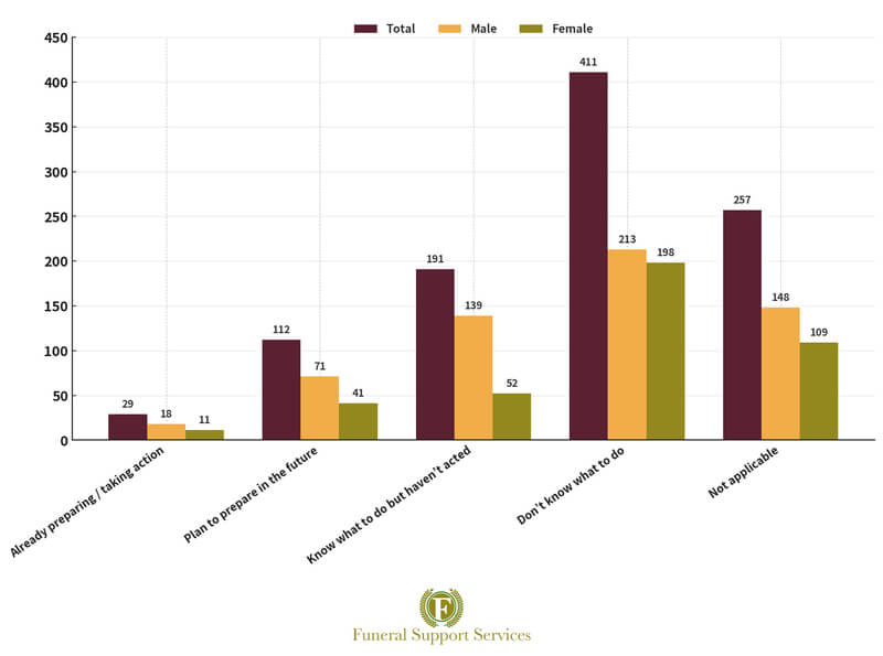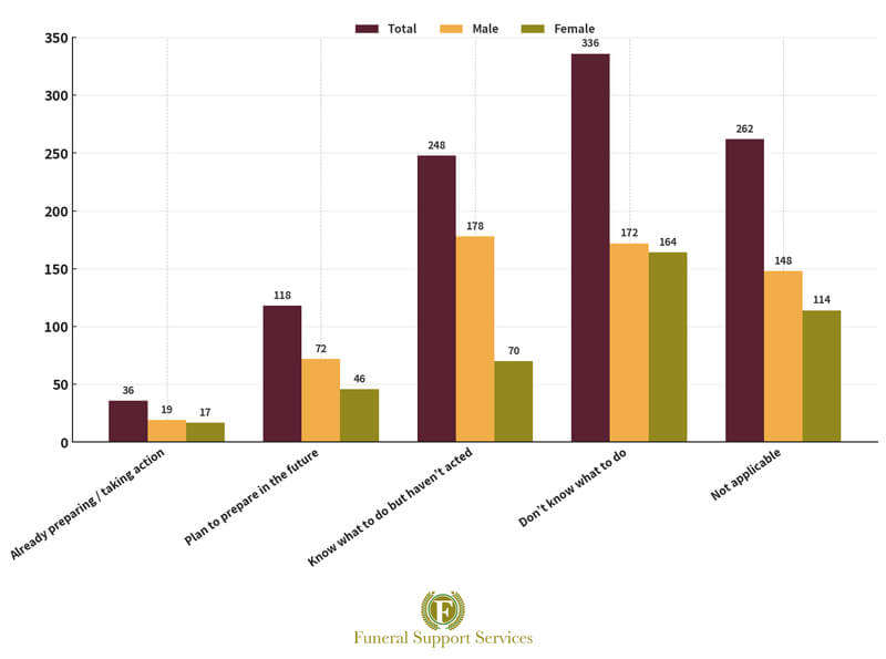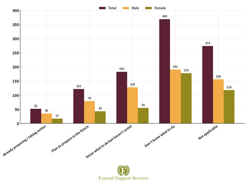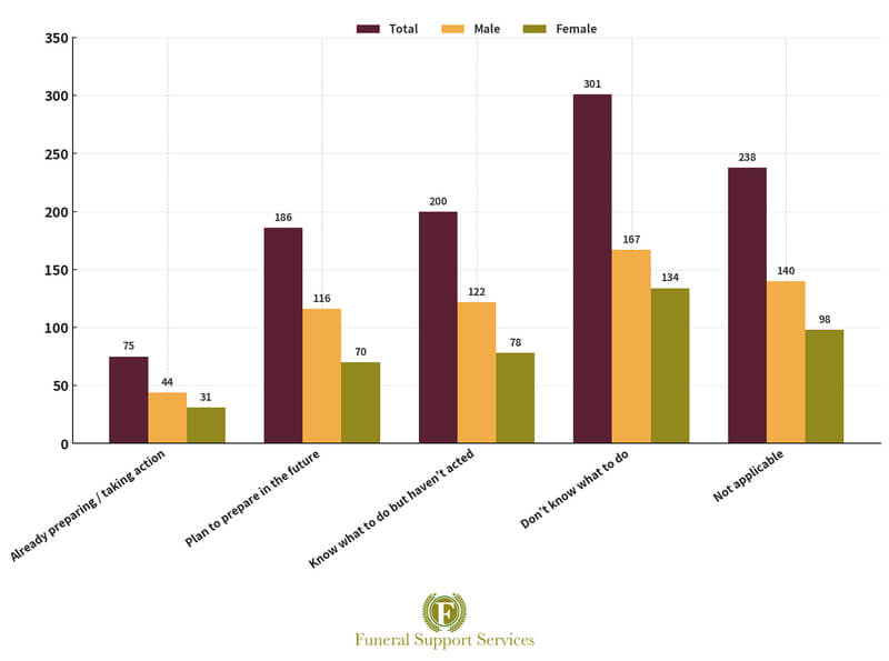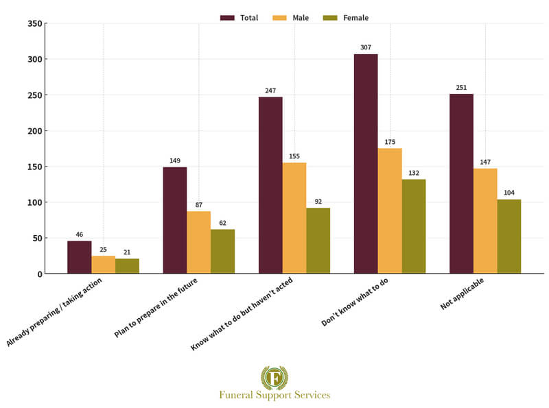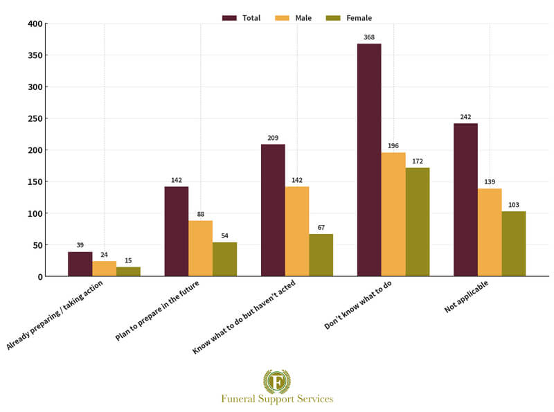 The findings suggest a clear gender divide in readiness. Men tend to hesitate despite understanding the process, while women are more likely to feel unsure about what needs to be done. In both cases, actual preparation remains limited.