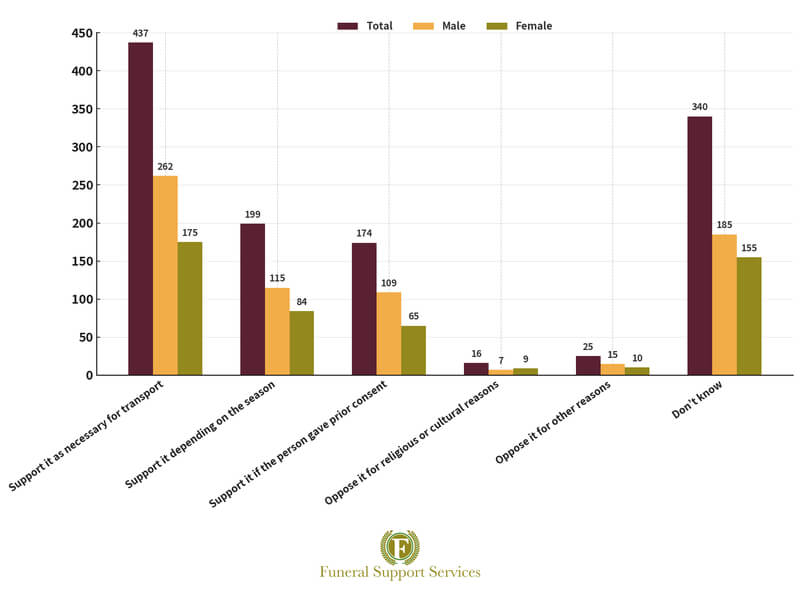 Most people see embalming as a practical solution for specific situations like long-distance transport. Conditional acceptance—based on season or prior consent—is also notable, while outright opposition is rare. However, the high share of “don’t know” responses signals unfamiliarity or hesitation among a significant portion of the population, especially among women. This suggests room for greater public education or clarity around embalming practices.