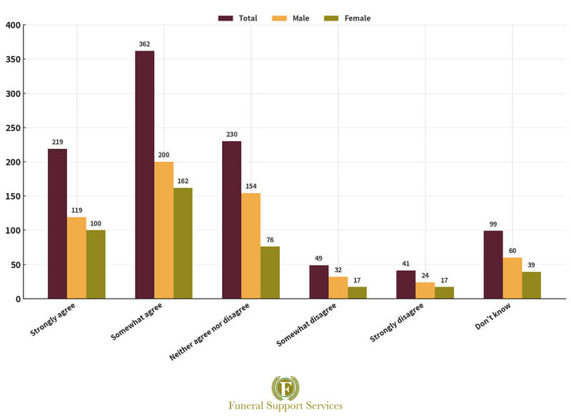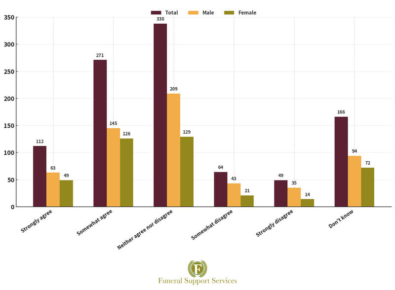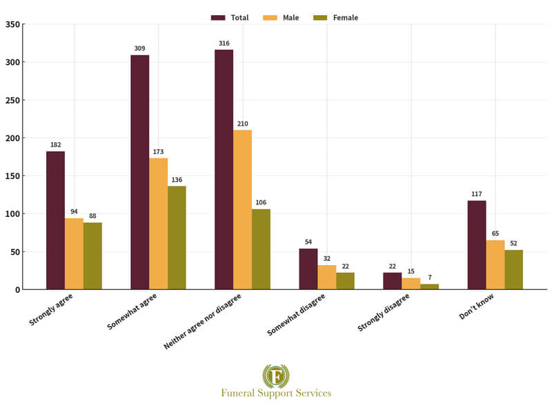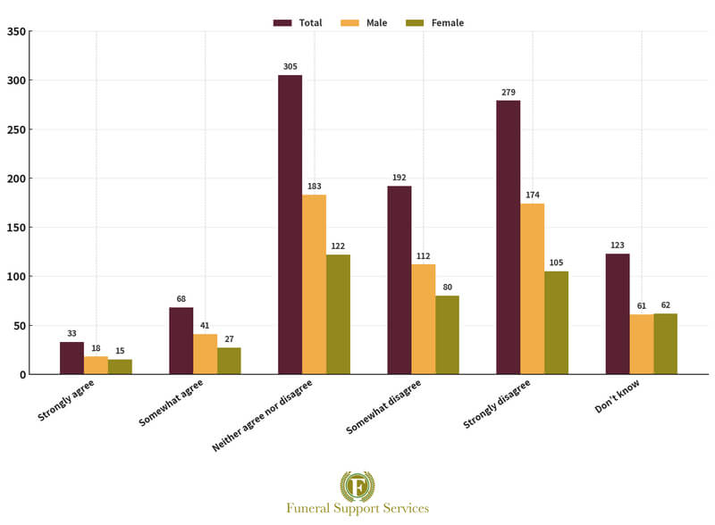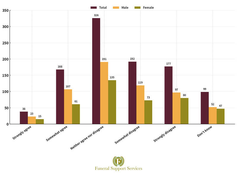 Responses show mixed views on sea burials. About one-third (32.7%) agree to some extent, while the largest group is neutral (37.4%). Another 15.6% disagree, and 14.3% say they don’t know. Overall, cautious openness is common, but many remain undecided.