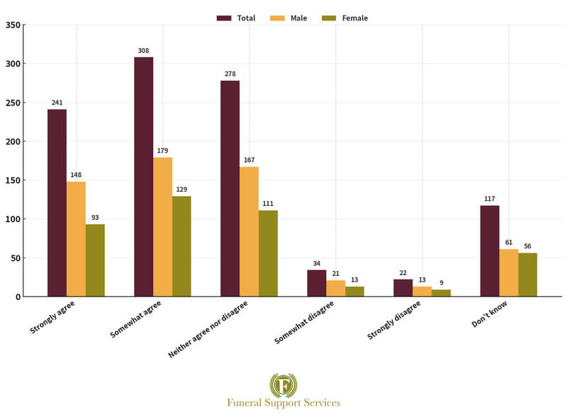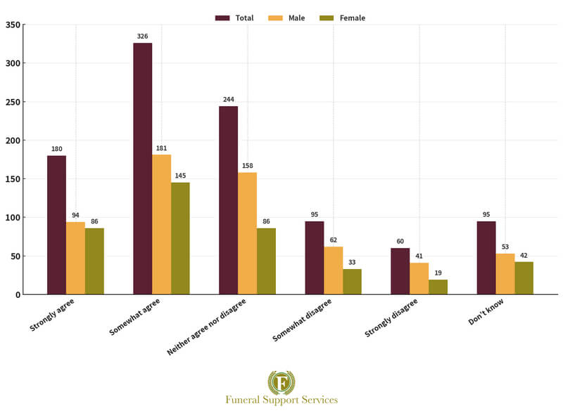 While tree burials are viewed positively overall, strong support is limited. Women tend to be more open to this eco-conscious option, while men show more hesitation or neutrality. Many respondents are still unsure, suggesting room for greater awareness.