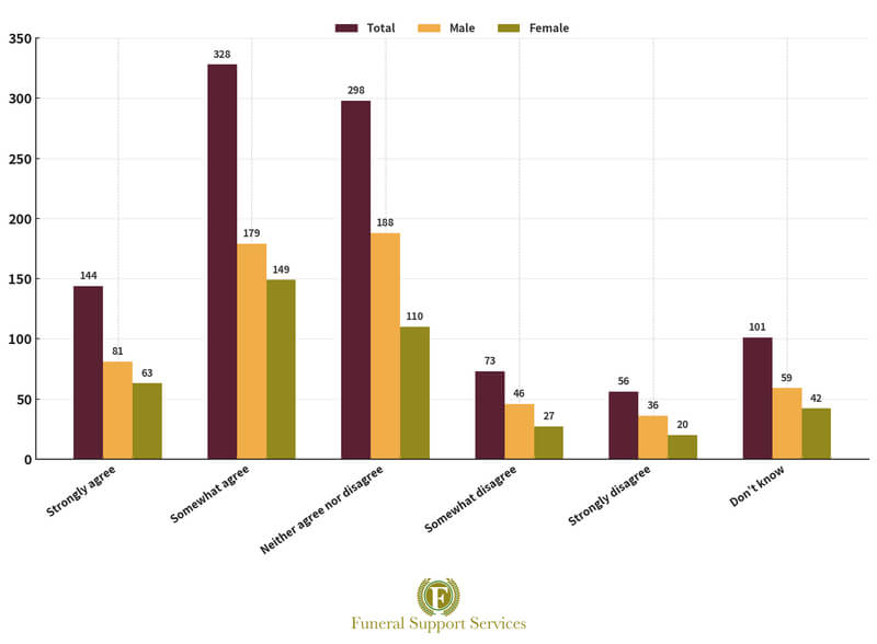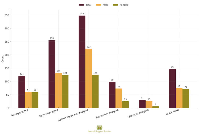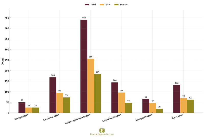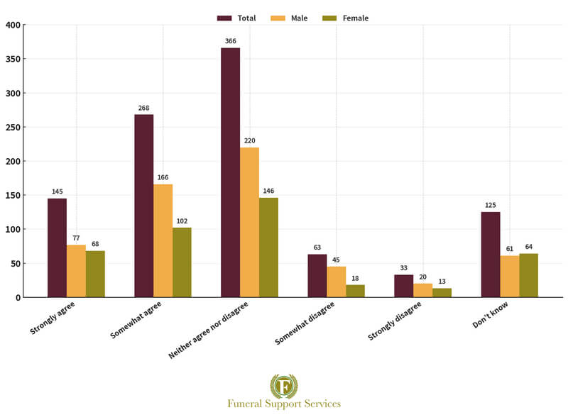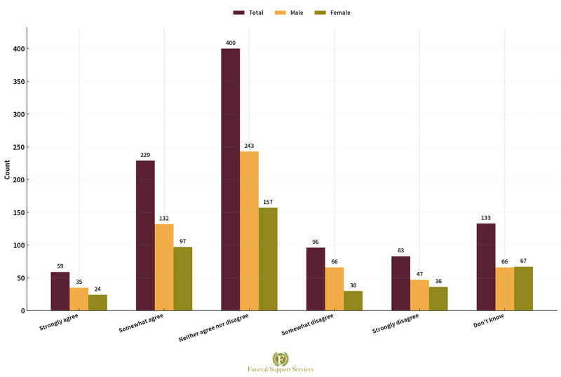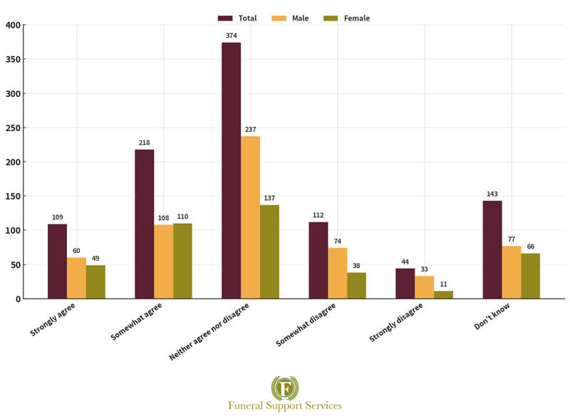 The results suggest that most people value having a clear plan for post-death procedures. While men are more likely to take a neutral stance, the overall trend points to a widespread sense of comfort that comes with clarity.