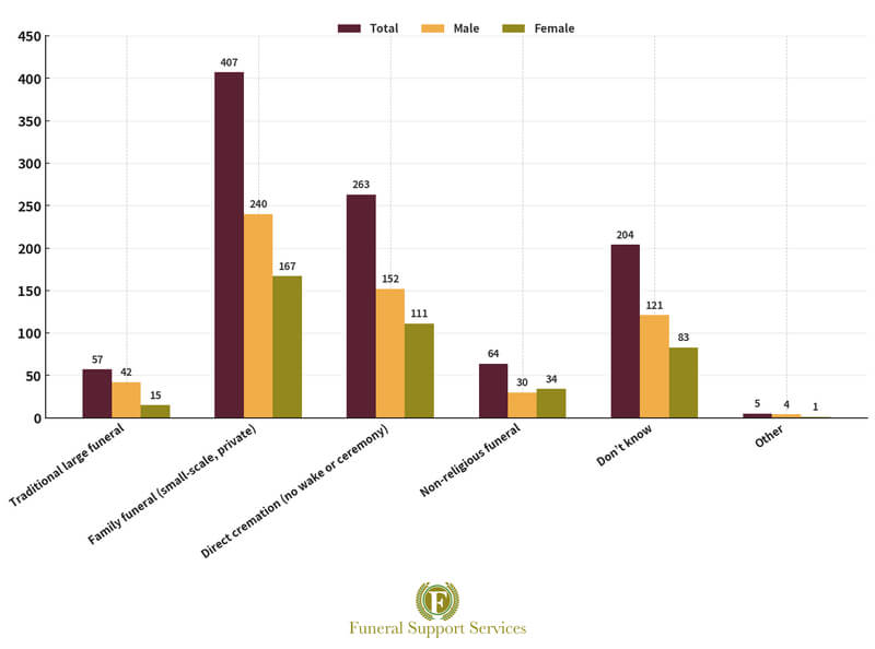 - Preferred funerals are modest and simple (family-focused, quick); explain trade-offs: cost, speed, and time for goodbyes.