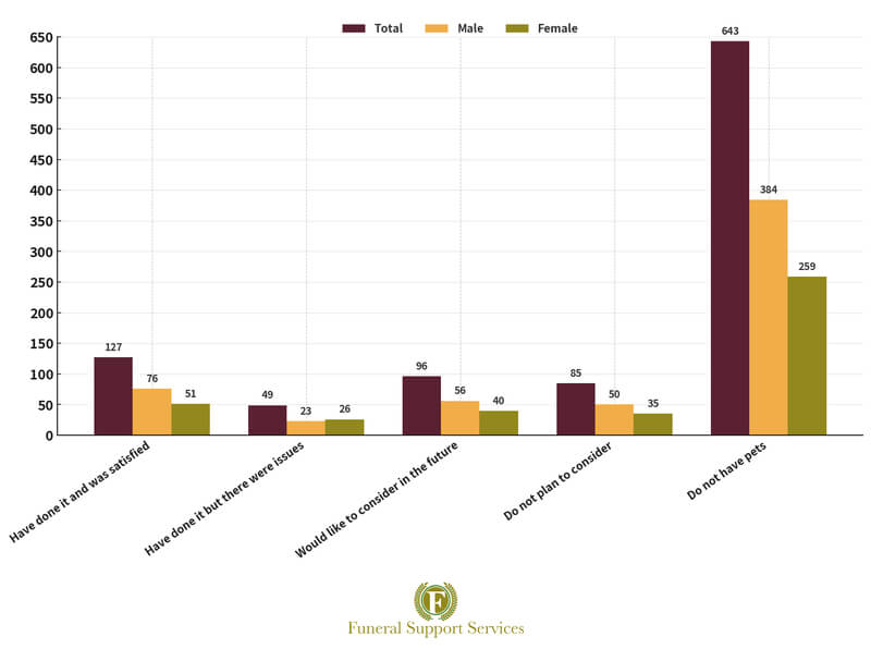 Professional pet funeral services remain niche, likely due to the high number of people without pets. However, among those who have used such services, satisfaction is relatively high. The lack of gender differences suggests views on pet memorials are not strongly shaped by gender, but rather by pet ownership and personal preferences.