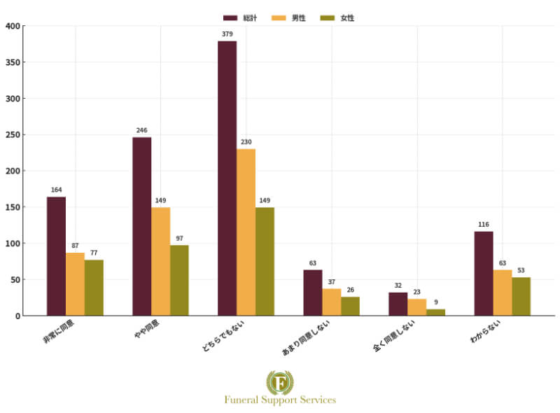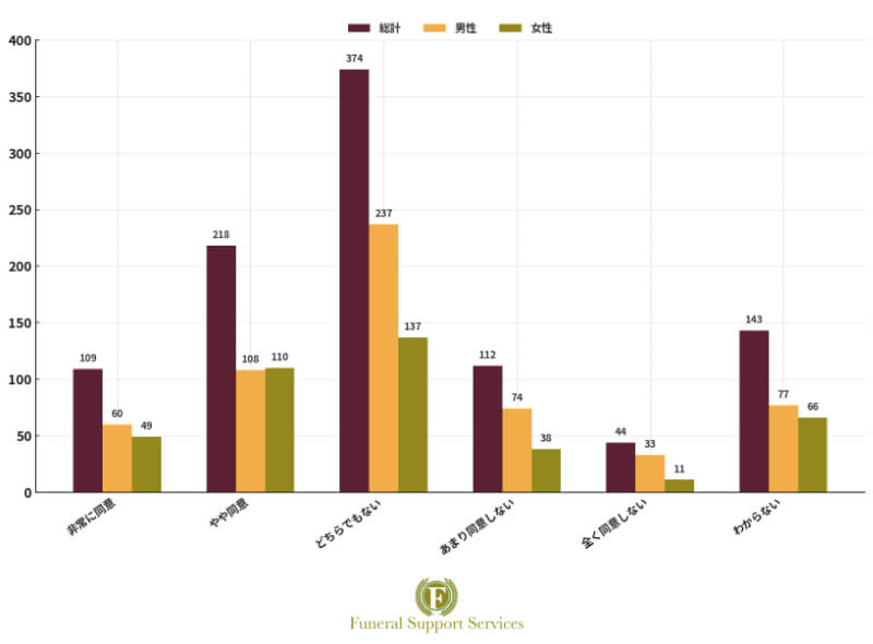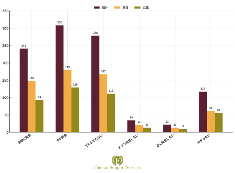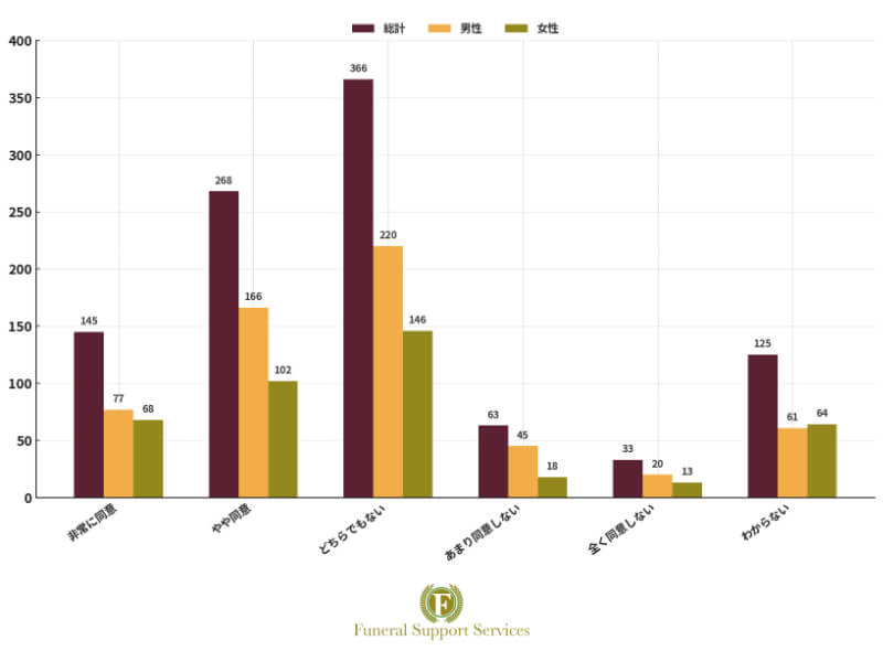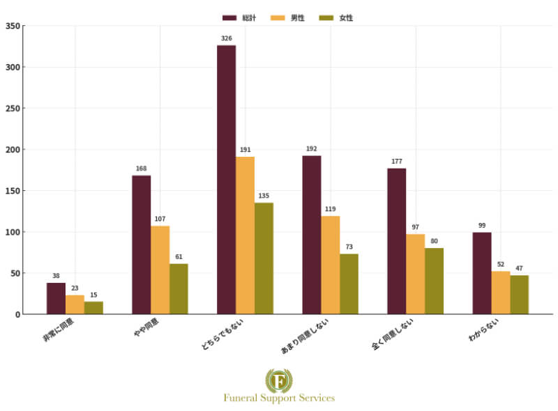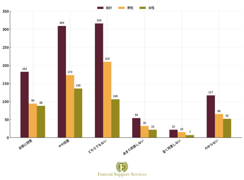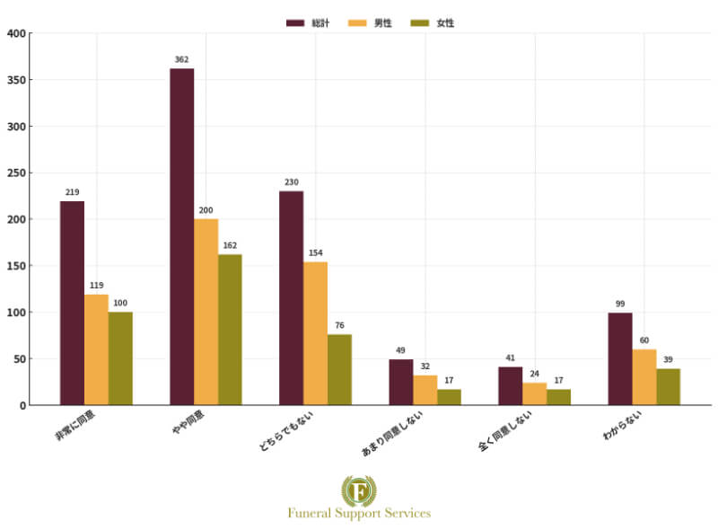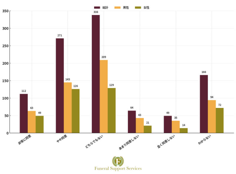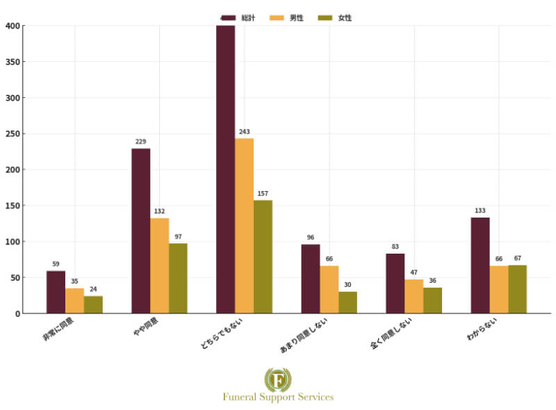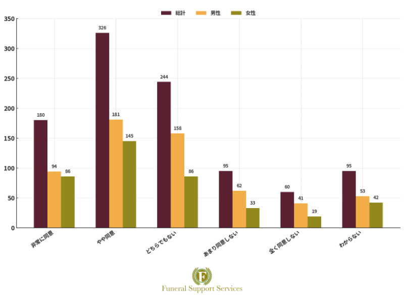 死後に家族へ負担をかけたくないという思いは広く共有されていますが、特に女性の方がその懸念を強く抱いている傾向が見られます。男性はやや中立的な立場をとる傾向があり、このテーマに対する関心や感情の向き合い方に性別による違いがうかがえます。