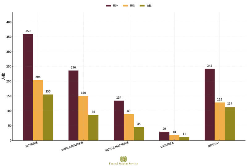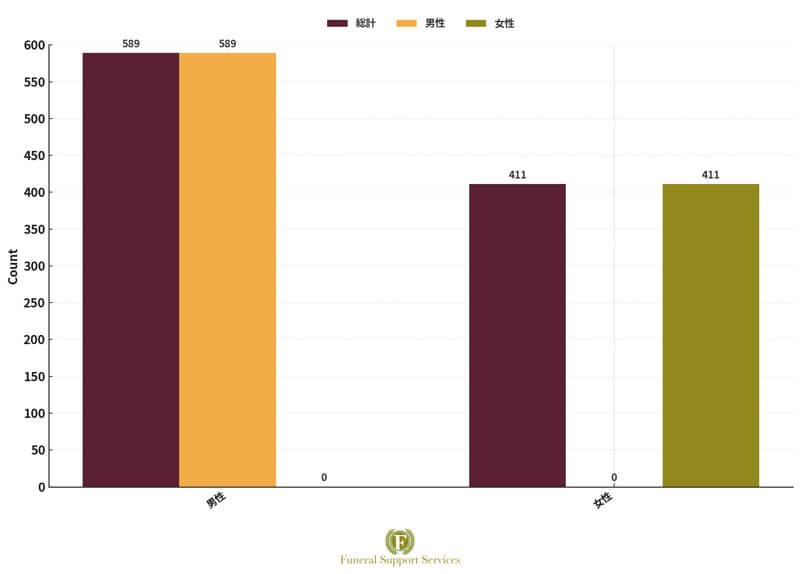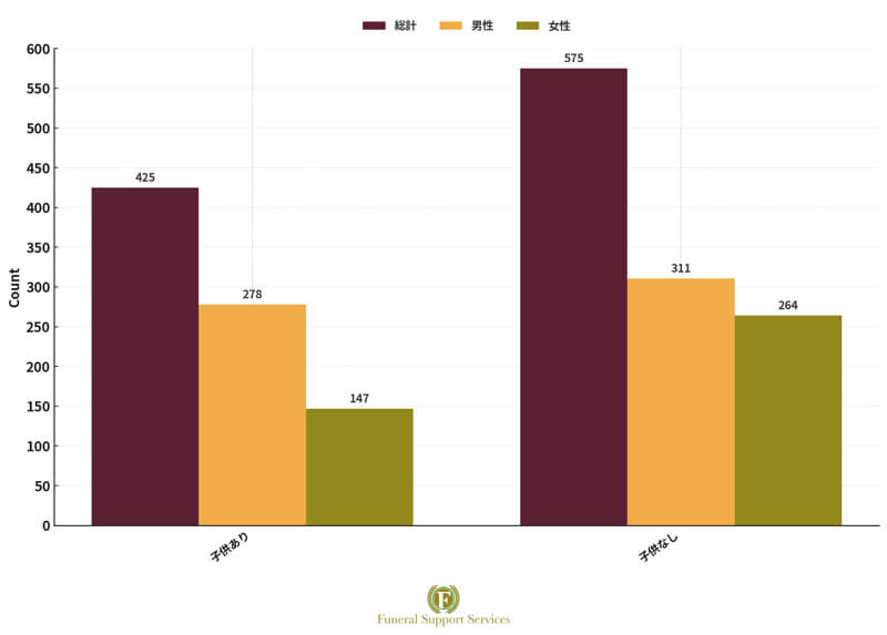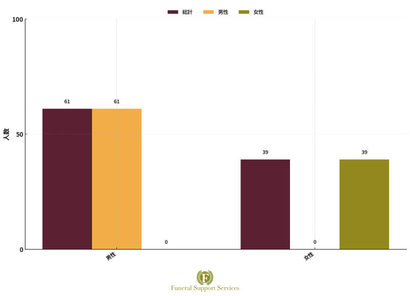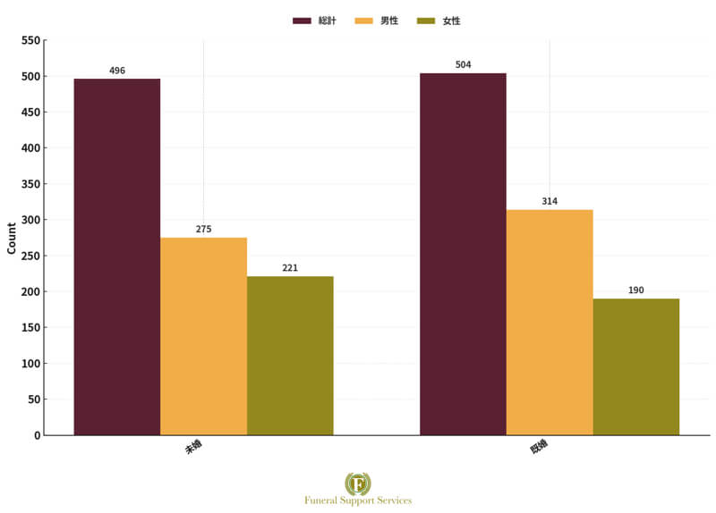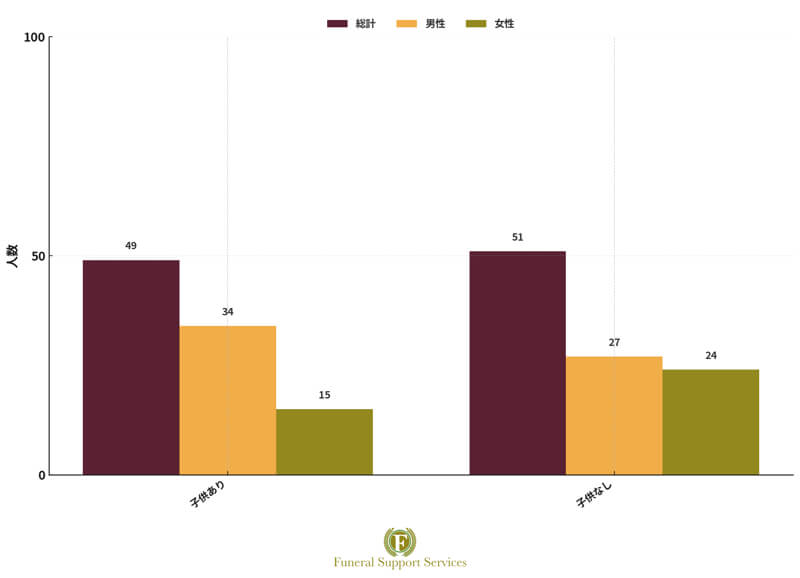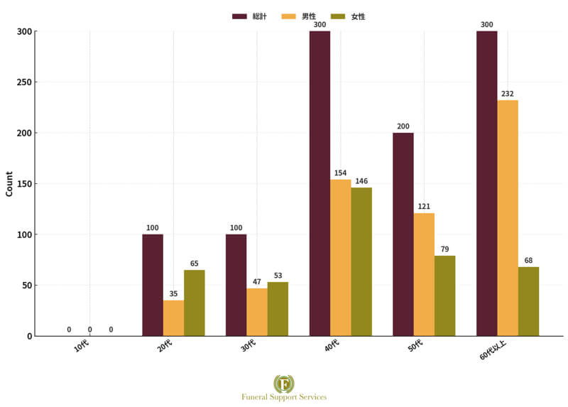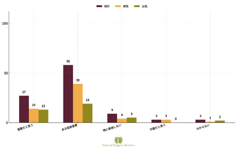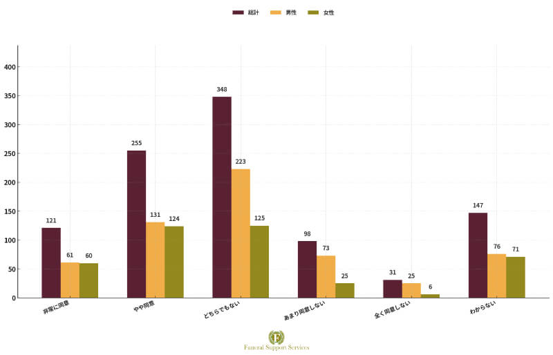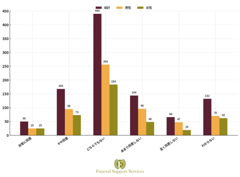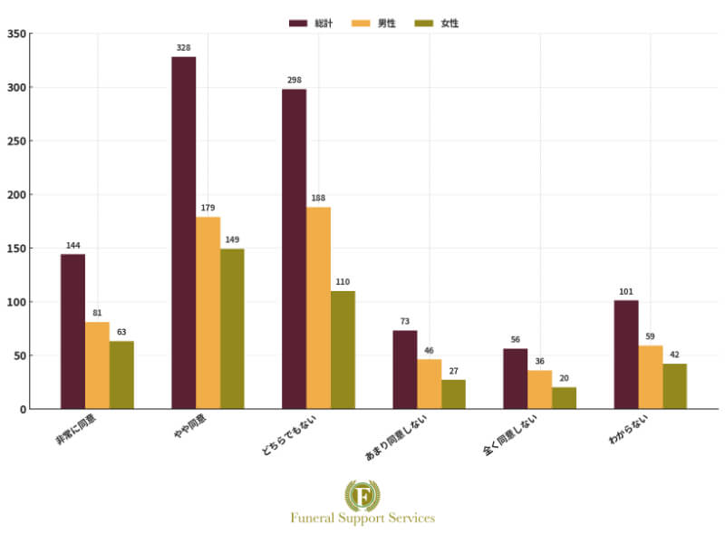 死後に家族へ負担をかけたくないという思いは広く共有されていますが、特に女性の方がその懸念を強く抱いている傾向が見られます。男性はやや中立的な立場をとる傾向があり、このテーマに対する関心や感情の向き合い方に性別による違いがうかがえます。