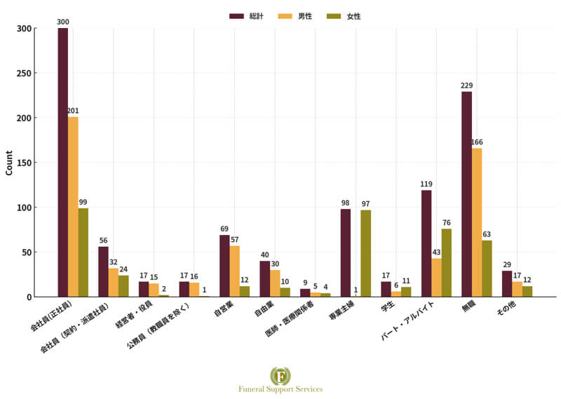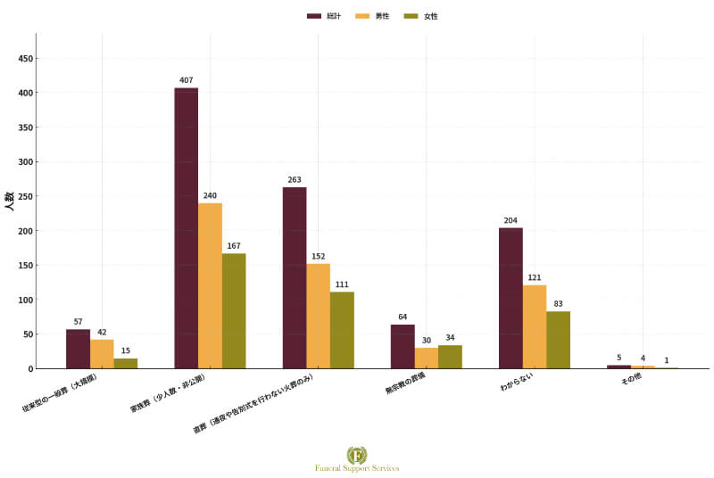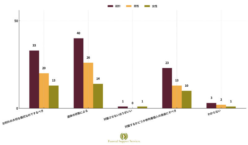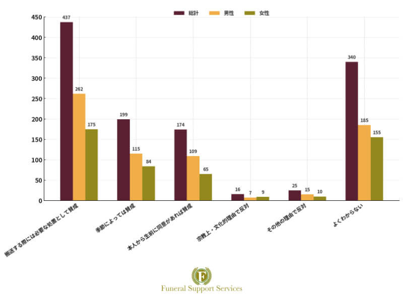 防腐処置については、特に遺体搬送時の必要性から支持する声が多く、条件付きでの支持(季節や生前同意)も一定数見られます。明確に反対する意見は非常に少数派であり、全体として実用的な対応として受け入れられていることが伺えます。ただし、「よくわからない」という回答が多く、特に女性の間でその傾向が強いため、防腐処置の目的や内容についての理解が社会全体でまだ浸透していない可能性もあります。今後の啓発や情報提供が求められる分野といえるでしょう。