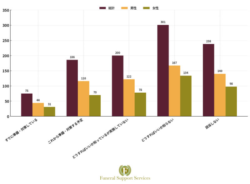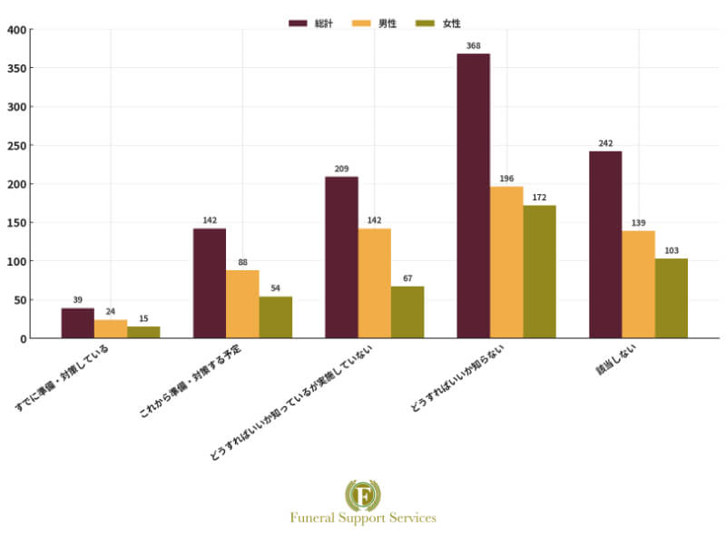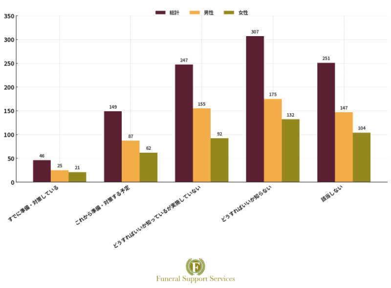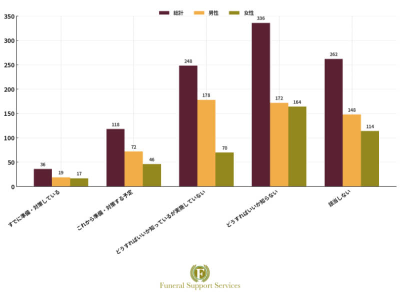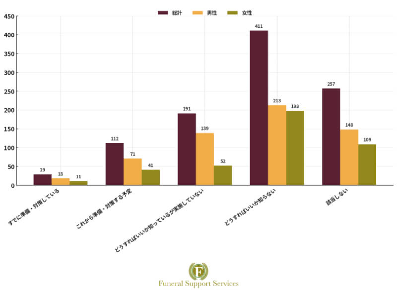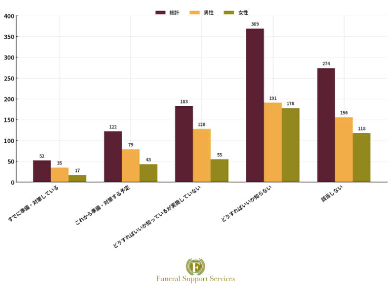 この結果からは、準備の段階において性別による傾向の違いが読み取れます。男性は「やるべきことは分かっているが行動に移せていない」状態にあり、女性は「何をすればよいか分からない」と感じている人が多いようです。いずれの場合も、実際の準備が進んでいないことが共通しています。