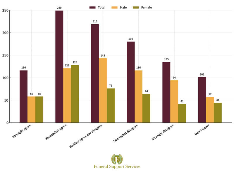遺体を長距離移送する際に防腐処置(エンバーミング)が必要だと考える人は多く、賛成が全体の54.9%(「非常に同意」24.1%+「やや同意」30.8%)を占めました。中立は27.8%、反対はわずか5.6%、そして「わからない」は11.7%でした。全体として、反対意見は非常に少なく、賛成または中立が大多数を占めています。