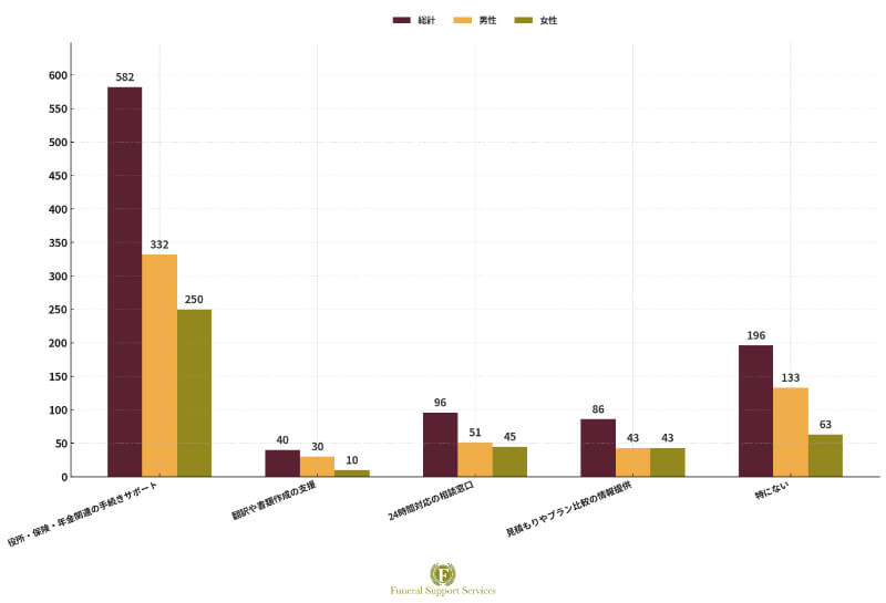 死後の行政手続きは煩雑であるため、多くの人が何らかの支援を求めています。中でも役所関係の対応が最優先される一方、特に男性の一部には「支援は不要」と考える傾向も見られました。