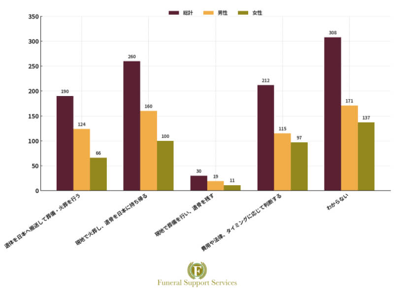 海外で日本人が亡くなった場合の対応については、「遺骨または遺体を日本に戻す」という意識が比較的強い一方で、多くの人が明確な意見をもたないことがうかがえます。法的・手続き的な知識の不足や経験のなさが、この背景にある可能性があります。