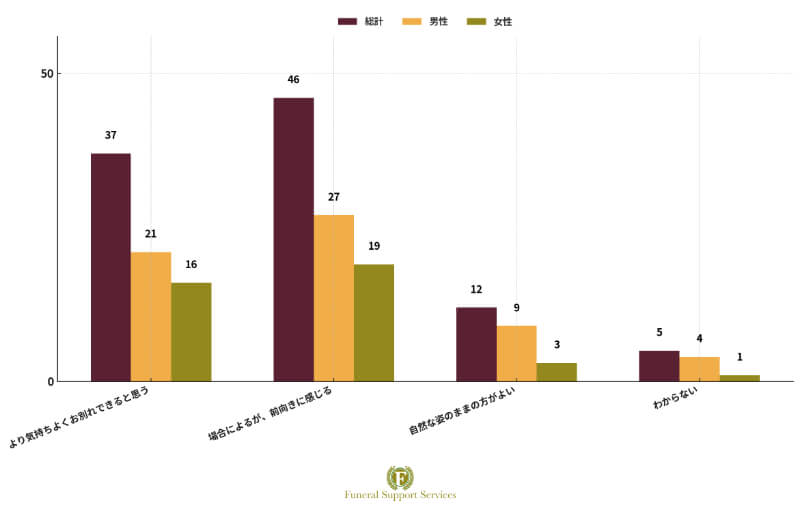 エンバーミングに対する受け止め方は繊細なテーマですが、季節的使用を前向きに捉えている層においては、見た目が安らかであることが感情面でのサポートになると考える人が多いことが分かります。「自然な姿」よりも「穏やかな見送りの場面」を重視する傾向が見られ、死後処置の視覚的な側面が意識されているといえるでしょう。