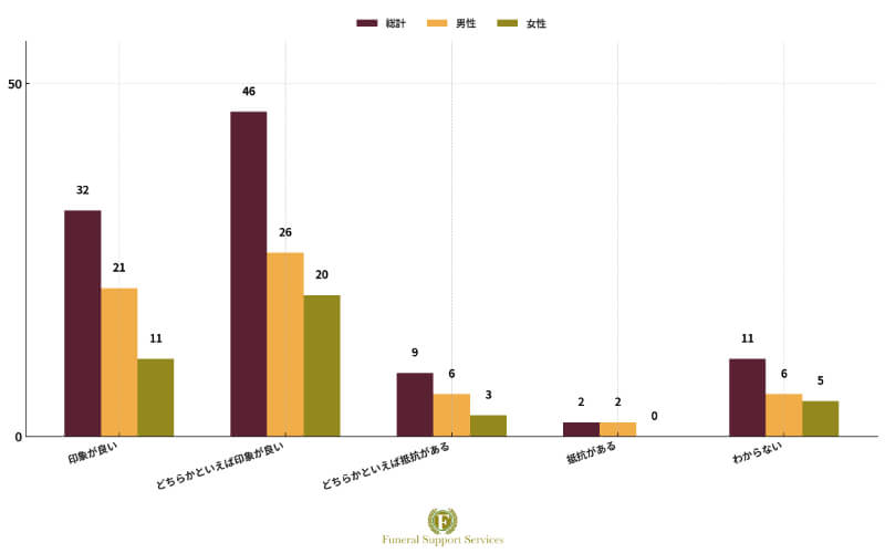 データは、エンバーミングに対する印象が概ね好意的であることを示しています。「印象が良い」が32%、「どちらかといえば印象が良い」が46%で、全体の約78%が肯定的またはやや肯定的な見方を示しています。抵抗感を抱いている人(「少し抵抗がある」「強い抵抗がある」)は約11%、また「わからない」と答えた人も約11%にとどまっています。全体としては、好意的な受け止めが主流であり、拒否感は少ないようです。