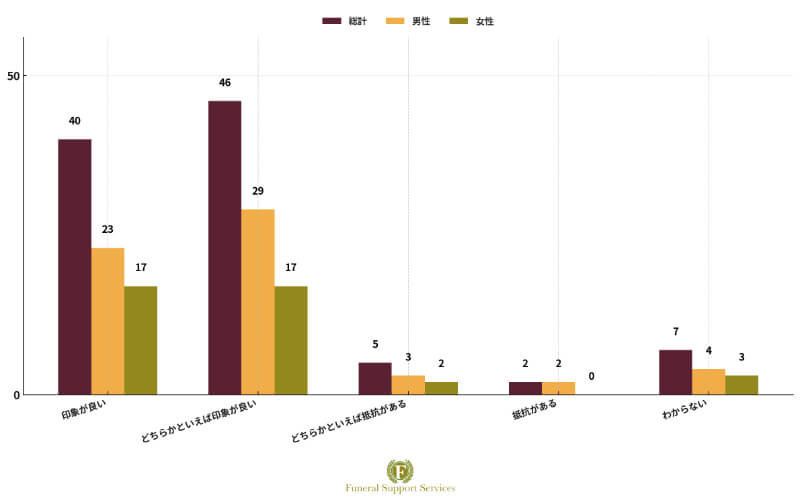無宗教の葬儀はまだ主流とは言えませんが、特に女性を中心に前向きな評価が広がりつつあります。中立や未定の層が多いことから、無宗教葬に関する理解や情報提供が進めば、受容の広がりが期待されます。