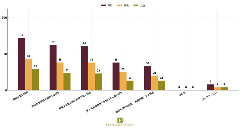 防腐処置が必要とされる状況は、暑さや長距離搬送、時間的な猶予といった実務的な要因が中心です。一方で、顔を見ての別れや海外搬送といった感情的・文化的要素も重要視されており、全体的に実用性と人間的な配慮の両面から捉えられていることがわかります。「わからない」とする人が少ない点からも、多くの人が具体的な判断基準を持っていると考えられます。